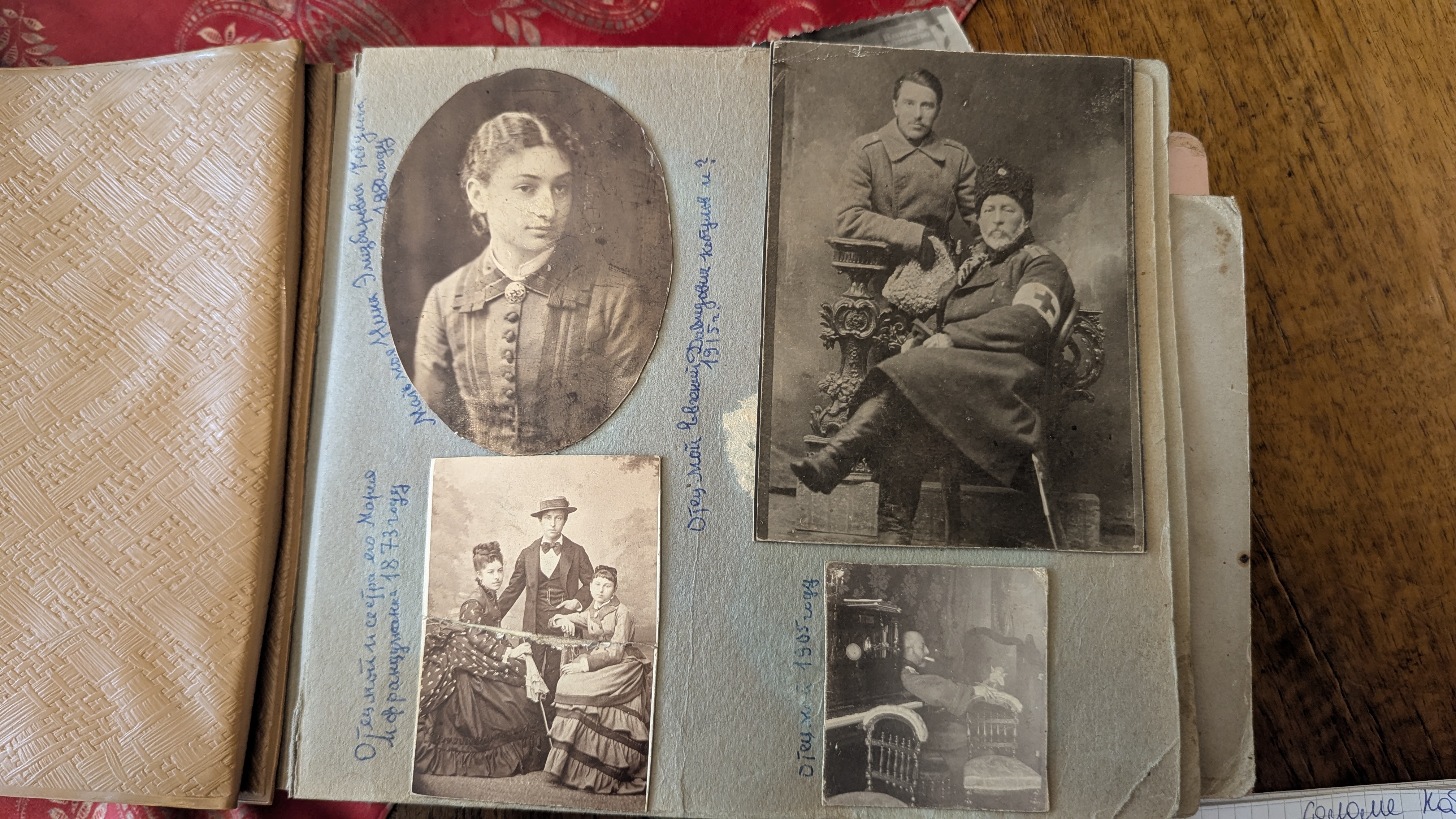 Саломея бережно листает альбом, ставший для семьи настоящим путеводителем по прошлому. Её дед, Давид, проделал огромную работу, чтобы спасти от забвения имена и лица родных. В этом альбоме нет „незнакомцев“ — каждая фотография снабжена подробным комментарием. С пожелтевших страниц на меня смотрит и сам автор Давид Кобулашвили, молодой красавец с офицерской выправкой, часто – на породистом скакуне.
